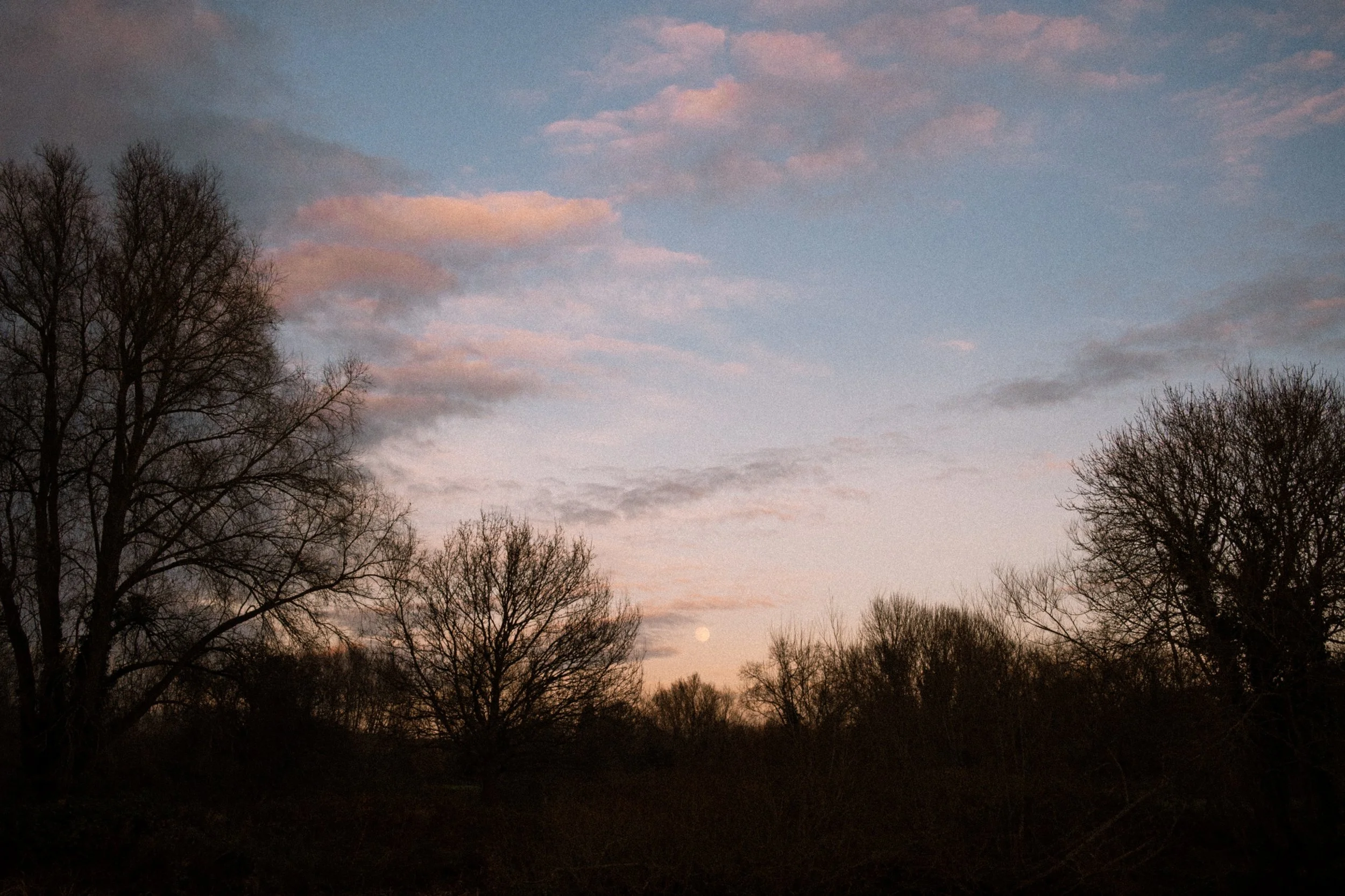 I love this kind of light because it’s so quiet you almost miss it. No drama, no fireworks, just that gentle moment where the day clocks off and the trees turn into silhouettes. The moon’s trying to be subtle, but it’s absolutely the main character. Same, honestly